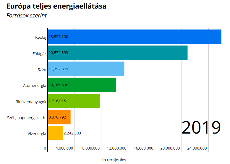 Európa teljes energiaellátásnak alakulása 1990-ben és 2019-ben energiaforrások megoszlása szerint