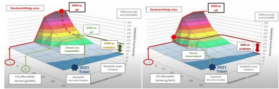 A COP26-on elhangzott egyik előadásból az derült ki, hogy elvben el lehet érni a 2050-re kitűzött klímavédelmi célokat csupán a kiszámíthatatlan megújuló energiaforrásokra alapozva is (ez a német modell), de az elfogadhatatlanul magas költségekkel járna. A jelenlegi technológia alapján az egyetlen finanszírozható, tehát járható út az, ha a nukleáris és a megújuló energia termelését kiegyensúlyozottan, együtt fejlesztjük – ezt érzékeltetik az alábbi ábrák.